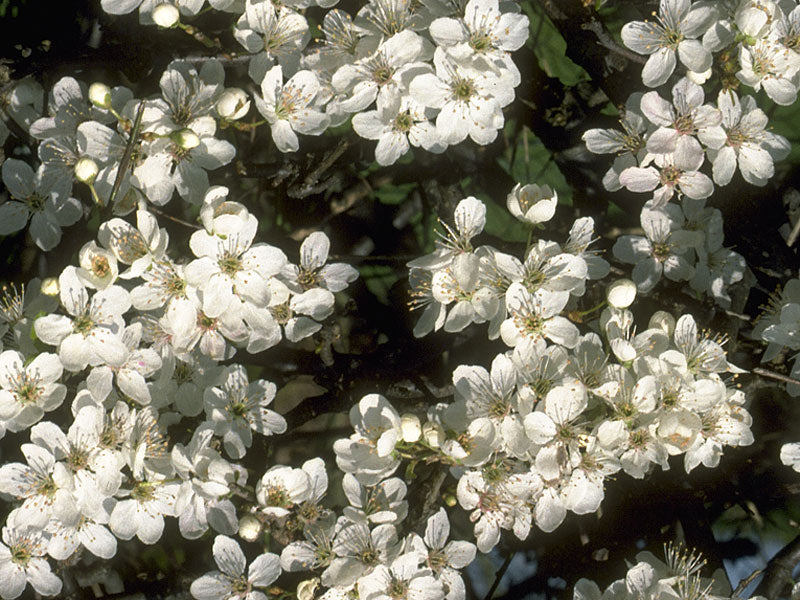 This is very much a remedy of light and dark and if we look at the tree in flower in the early spring that is what we see: the intense white blossoms clustered on the black branches, with only the bright beginnings of green leaf buds. Cherry Plum, Prunus cerasifera, is the first white blossom of the year coming before pear, cherry or other fruits, earlier than the blackthorn sloe. It is a slender, small tree with slightly drooping branches, of no great physical strength, even weak in appearance. There are often several stems in the trunk as though several trees are growing together, like multiple ‘I’ forms. The single upright trunk of Oak or Elm betokens a clear and strong individuality, by contrast. It is expressly the problem of Cherry Plum that this individual integrity has been breached. The same thing is to be seen in the bark which is smooth and speckled without clear energetic structure lines. The strength of the gesture is to be found in the brilliant and exuberant flowering, not in the structure of the trunk and branches. The tree is alight with the blaze of the spirit. It shines into the darker recesses of our mind, clearing and ordering our mental confusion…. With the Cherry Plum state there is a pressure from the non-physical world that distorts our normal boundaries, breaking through the controls that would otherwise bring certainty in the process of life. We are right to be afraid.
